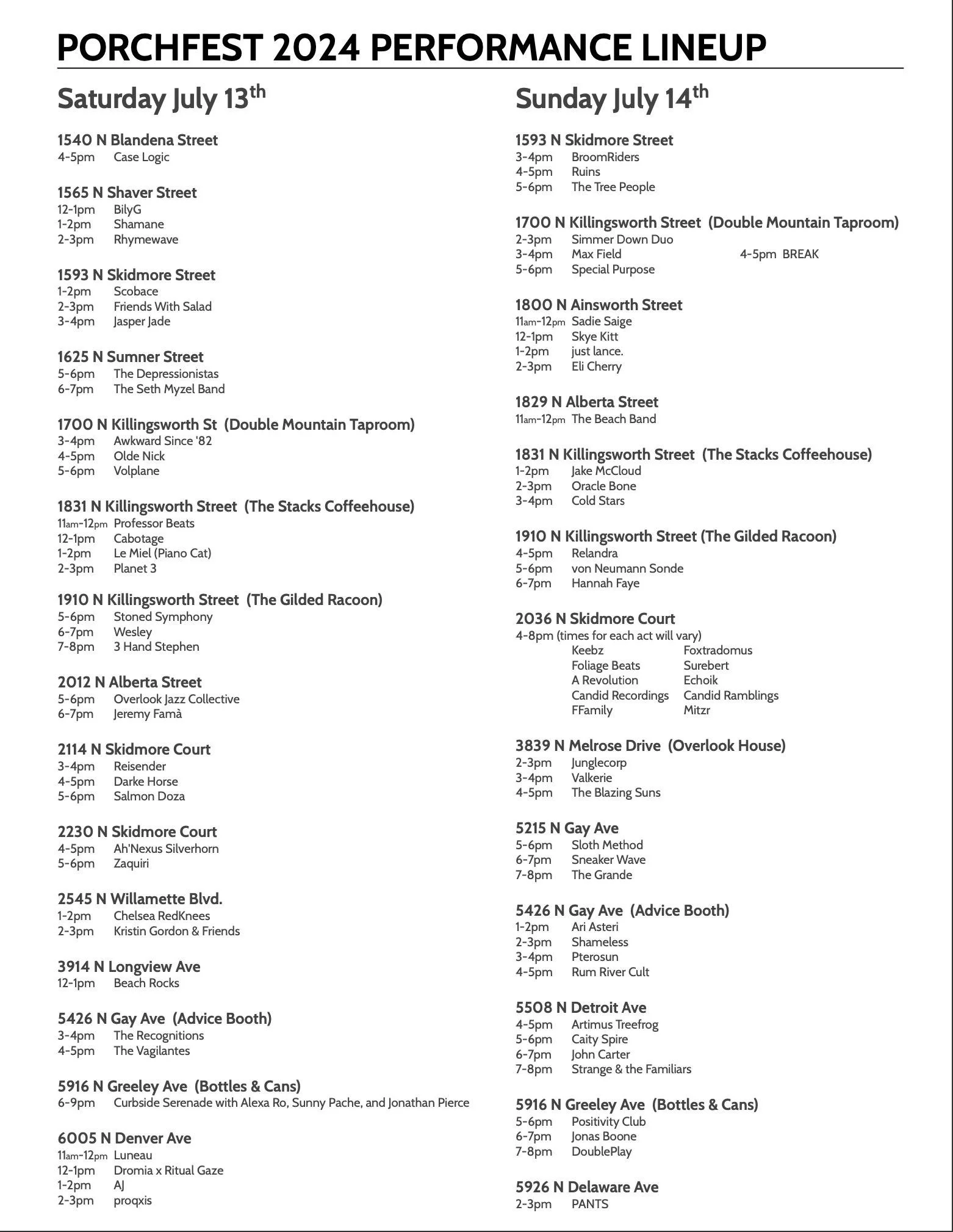 Porchfest is a free music festival in which porches, front yards, and local businesses throughout the Overlook neighborhood activate to become stages for bands to play, for people to gather, and for joy, connection to fill the streets in a way that is accessible for all. It is an opportunity to lower the barriers between public and private space.
